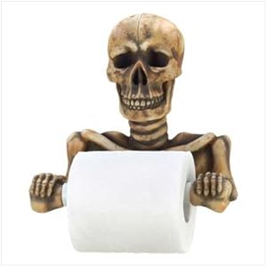 This bony fellow's grinning every time the paper's spinning. Spooky toilet paper holder is a most unexpected addition to your bathroom; a daring decorator's dream come true! Weight 1.7 lbs. Polyresin. Toilet paper not included. 8 1/4" x 4 1/2" x 8 3/8" high.